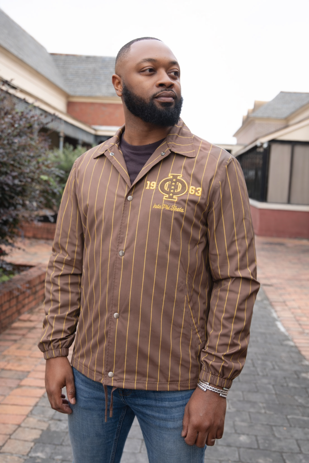 Make a statement rooted in legacy with the Iota Striped Coach Jacket. Designed in classic brown with gold pinstripes, this jacket blends timeless coach-style energy with unmistakable Iota pride. The front features the embroidered Iota Phi Theta crest with founding year details, while the back delivers a powerful reminder of the fraternity’s mission: “Building a Tradition, Not Resting Upon One.”