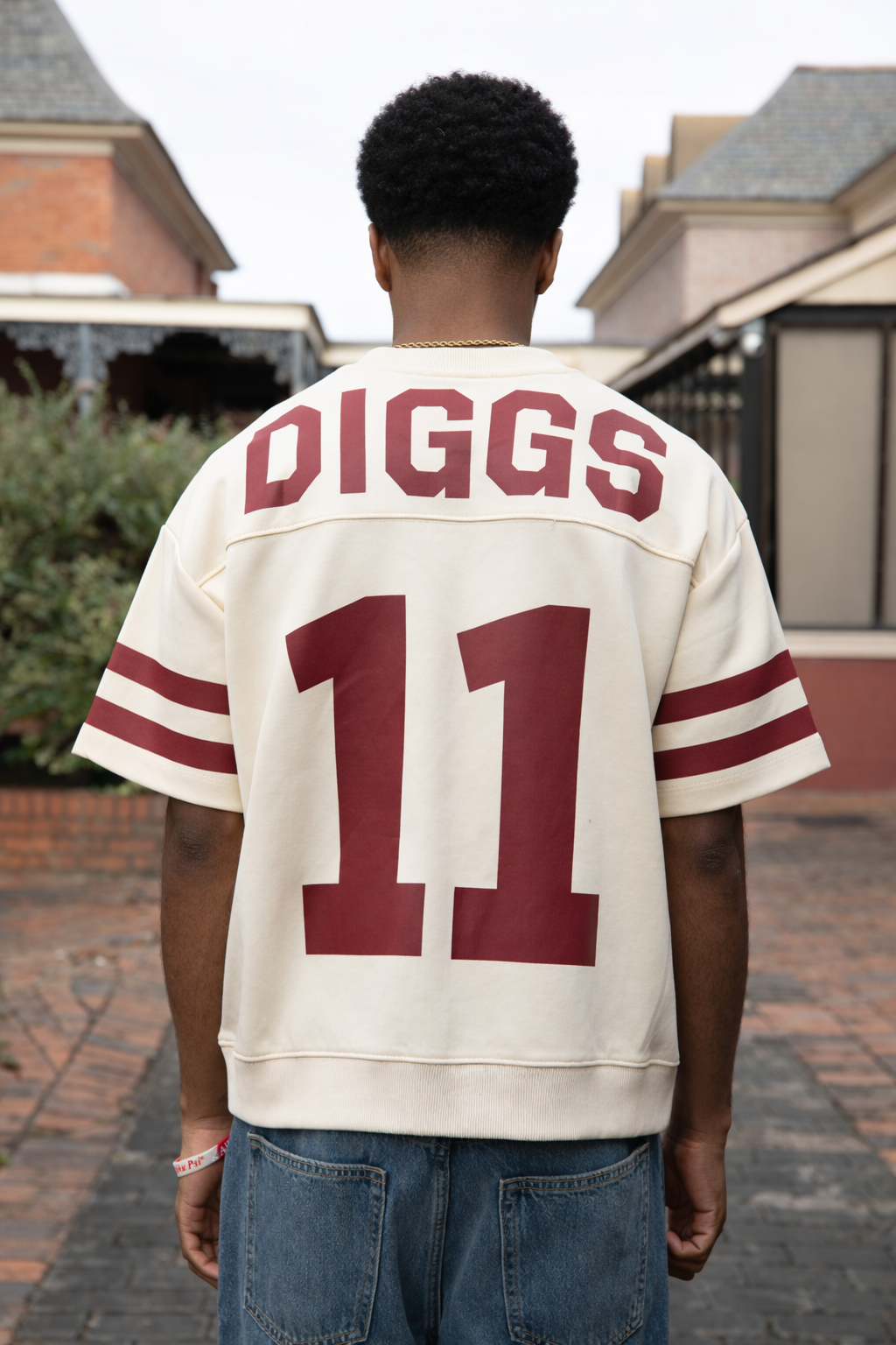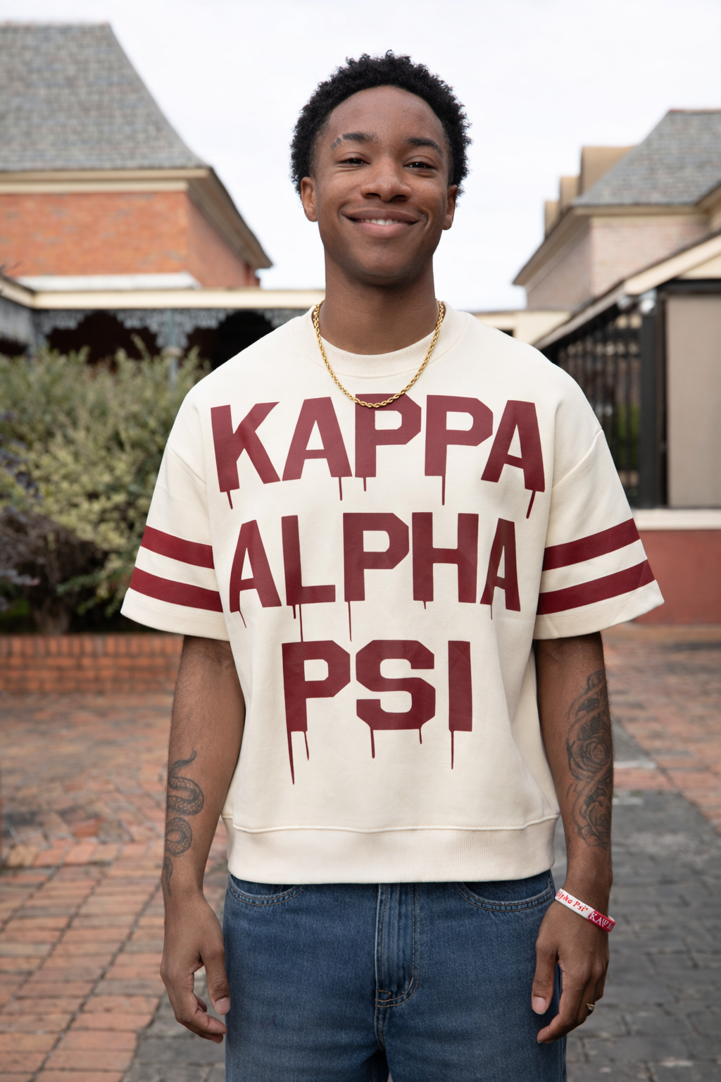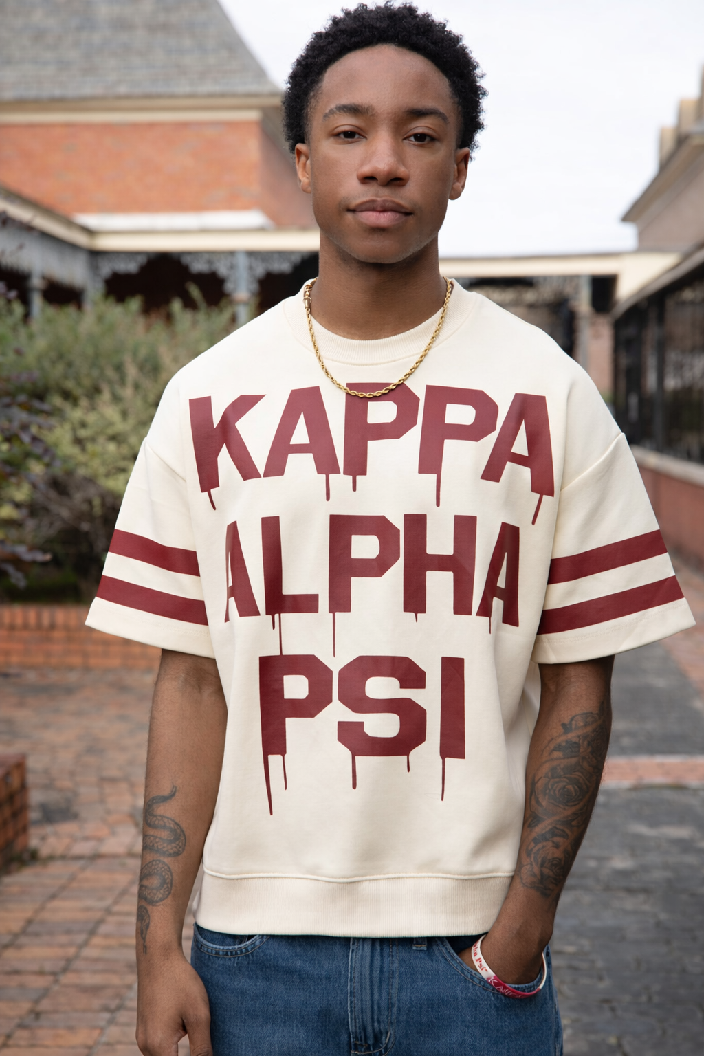 Make a bold statement with the Kappa Drip Tee, where heritage meets modern streetwear. This cream short-sleeve tee features a boxy, relaxed fit for an effortless silhouette. The front showcases a dripping Kappa Alpha Psi graphic in deep crimson, delivering a striking, contemporary edge. The back is finished with a jersey-inspired design, highlighting DIGGS across the shoulders and the iconic 11, paying homage to tradition with a custom, standout look.
