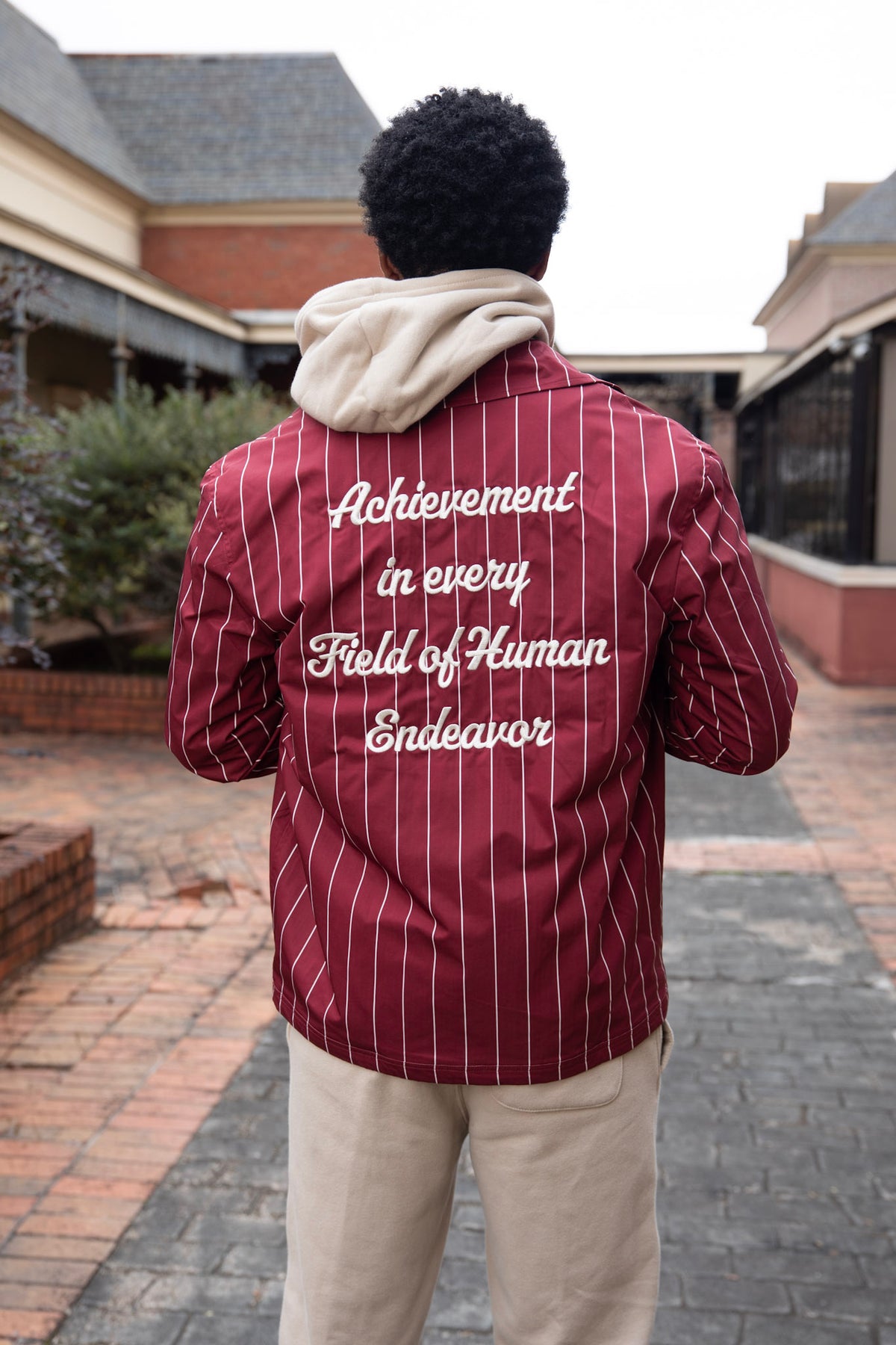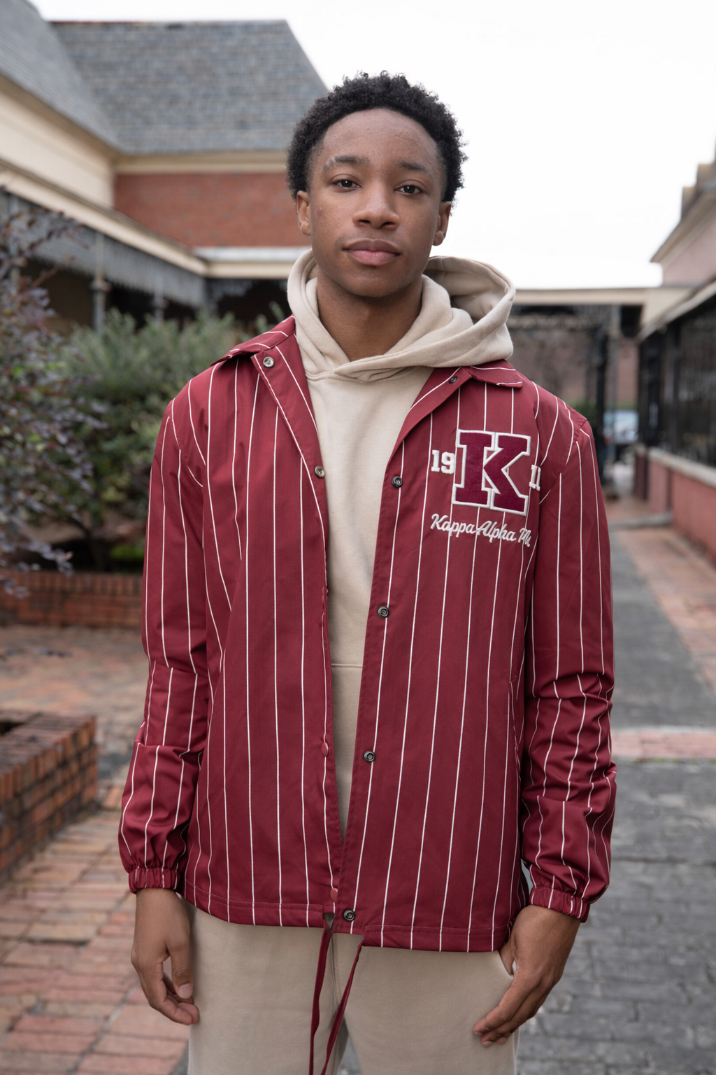 Make a bold statement with this premium Kappa Striped Coach Jacket, designed to blend classic athletic style with fraternity pride. Crafted in a rich crimson tone with crisp vertical pinstripes, this jacket features a clean snap-button front, adjustable drawstring hem, and elastic cuffs for a comfortable, tailored fit. The front is finished with embroidered Kappa Alpha Psi branding and founding year details, while the back showcases the iconic motto, “Achievement in Every Field of Human Endeavor,” stitched for lasting impact.