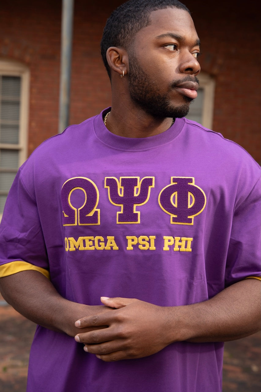 The front is detailed with bold ΩΨΦ (Omega Psi Phi) Greek letters and “Omega Psi Phi” text beneath, proudly representing the fraternity’s legacy and brotherhood. The clean silhouette and lightweight feel make this tee perfect for casual wear, layering, or pairing with denim and sneakers.