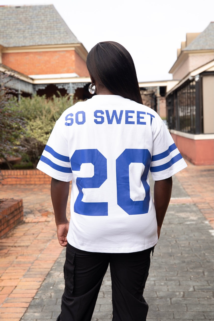 The front showcases bold “ZETA PHI BETA” lettering in a drip-style design, paired with athletic-inspired sleeve striping for a classic-meets-modern aesthetic. The back completes the look with “SO SWEET” across the shoulders and the number 20, paying homage to sisterhood, legacy, and pride.