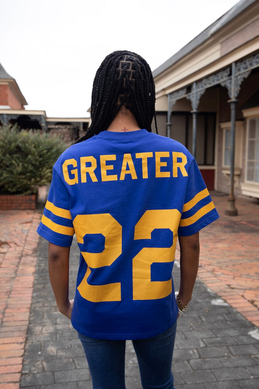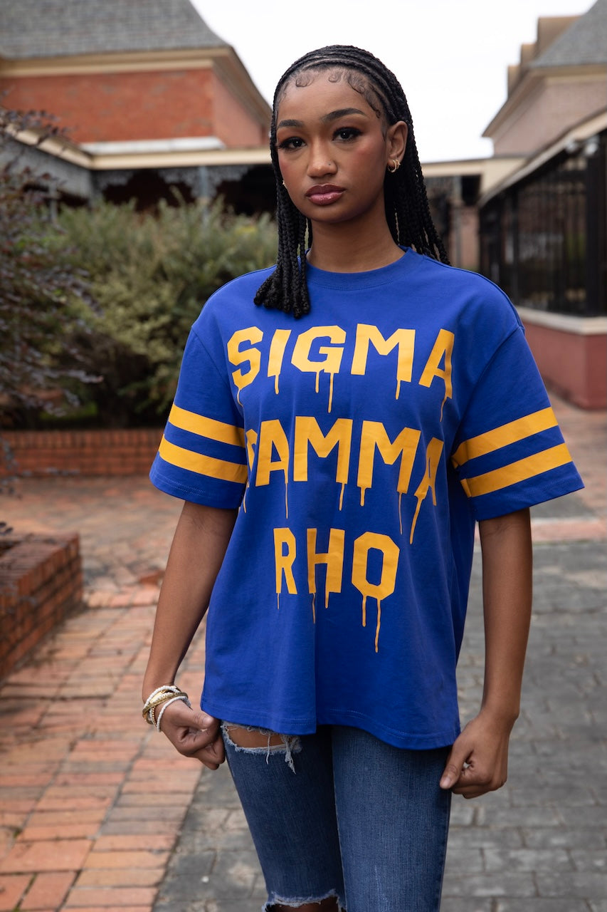 Make a bold statement in royal blue and gold with the SGRHO Boxy Drip Tee. Designed with a relaxed, boxy fit, this tee blends classic athletic styling with modern drip details. The front features “Sigma Gamma Rho” in a dripping gold graphic, while the back makes it official with “Greater” and the number 22, honoring sisterhood, legacy, and excellence. Finished with varsity-style sleeve stripes, this tee is perfect for casual wear, step shows, or repping your sorority with pride.