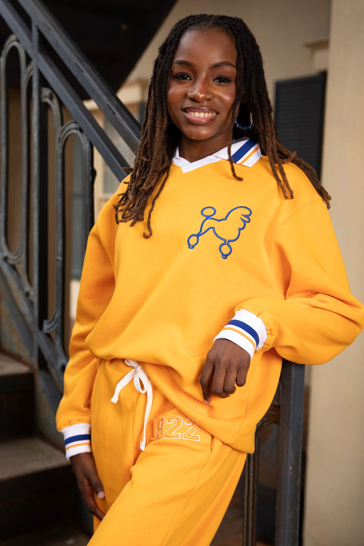 The Gold SGRHO Wide-Leg Fleece Set blends bold sorority pride with elevated comfort, designed exclusively for Sigma Gamma Rho Sorority, Inc.® Crafted in a rich gold fleece, this two-piece set features a relaxed pullover top with a classic collared neckline, accented by royal blue and white striping for a polished, sorority-inspired finish. The embroidered Poodle on the chest adds a refined yet unmistakable statement of legacy and sisterhood.