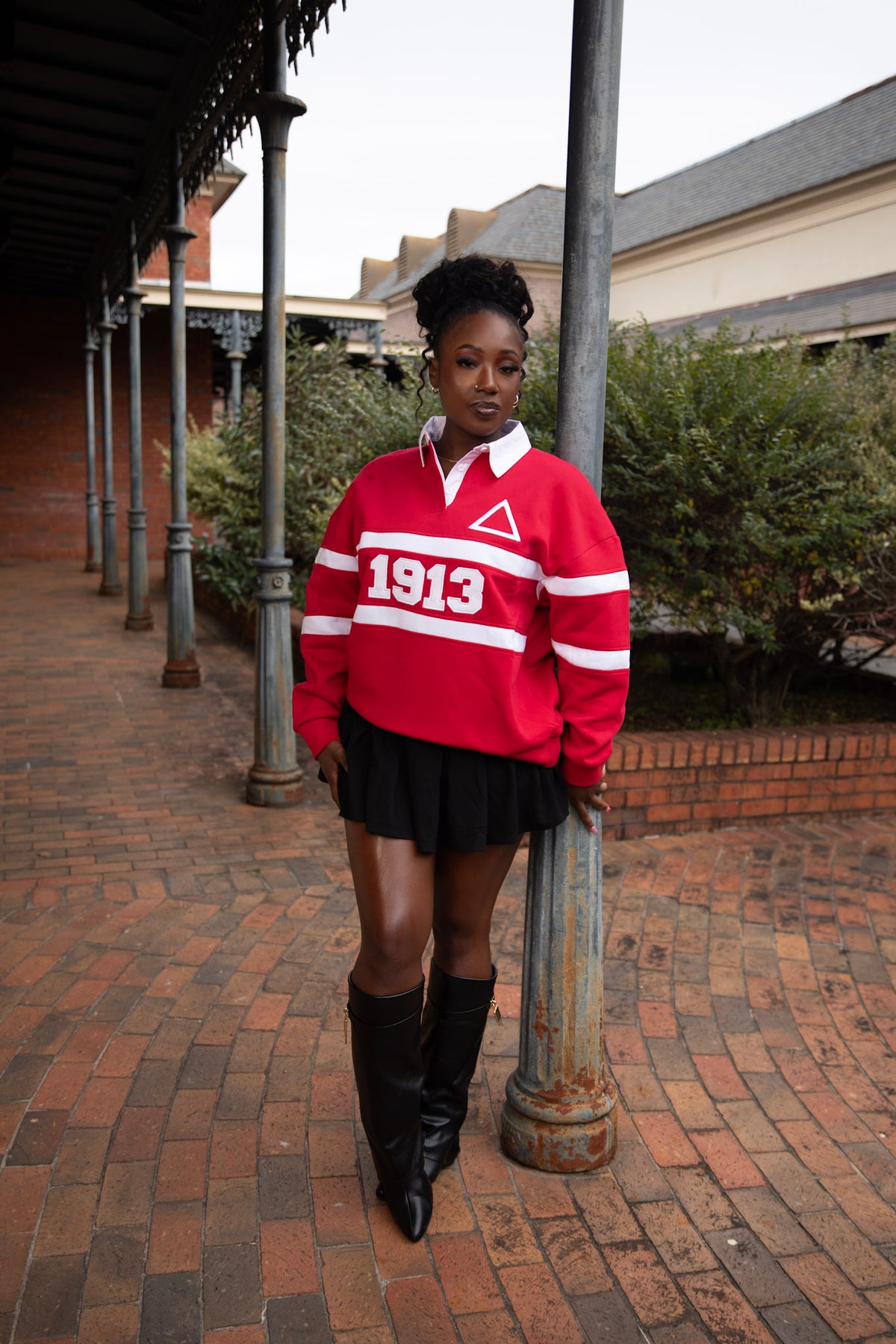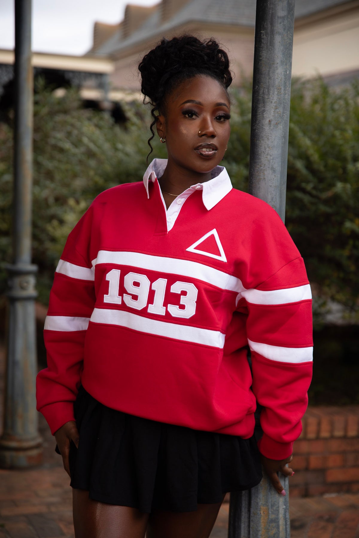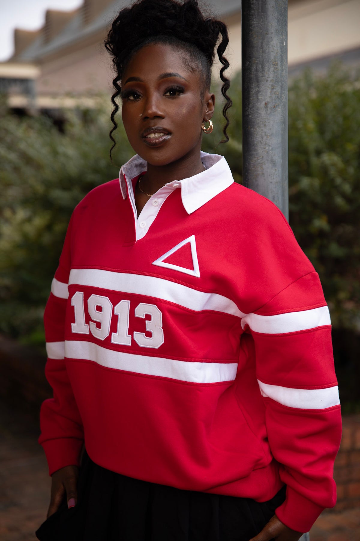 The front features a bold “1913” appliqué, proudly representing the founding year of Delta Sigma Theta Sorority, Inc. A clean white rugby collar adds a polished finish, while the embroidered Delta triangle symbol on the upper chest provides a subtle yet unmistakable nod to sisterhood.