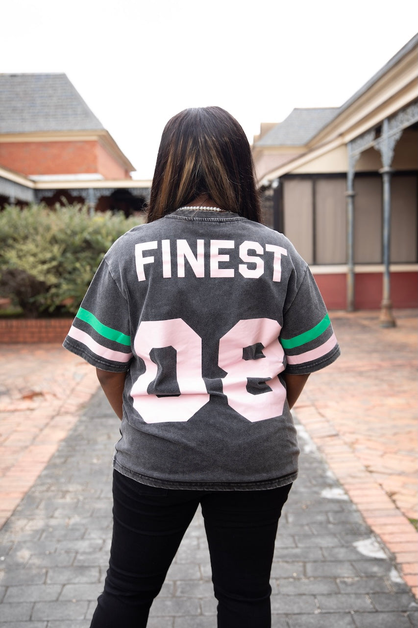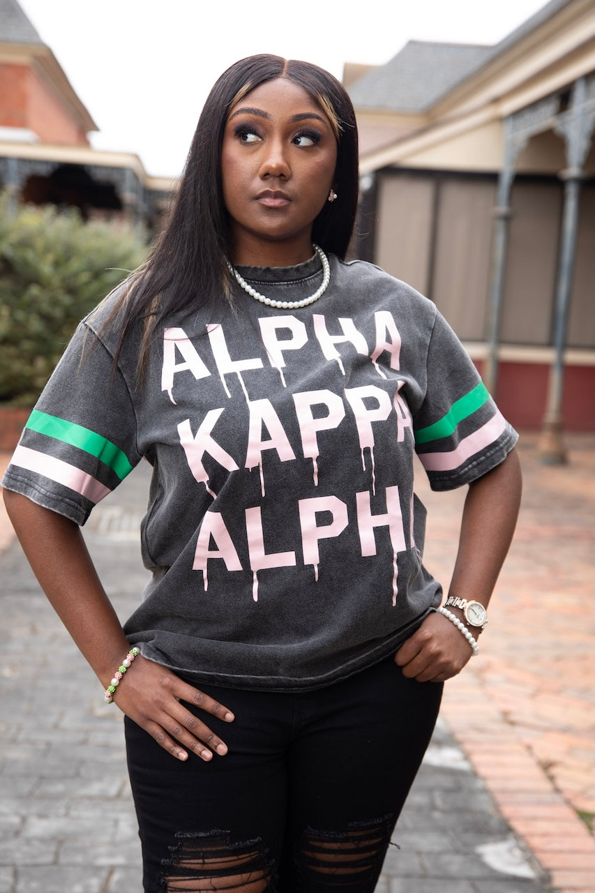 Make a bold statement with this vintage-inspired Alpha Kappa Alpha drip tee. Designed with a washed black finish, the front features oversized “Alpha Kappa Alpha” lettering in soft pink with a drip effect for a modern edge. Signature ivy-green and pink sleeve stripes add a sporty, throwback vibe. The back is finished with “Finest 08” in oversized block lettering, celebrating sisterhood, excellence, and timeless style.
