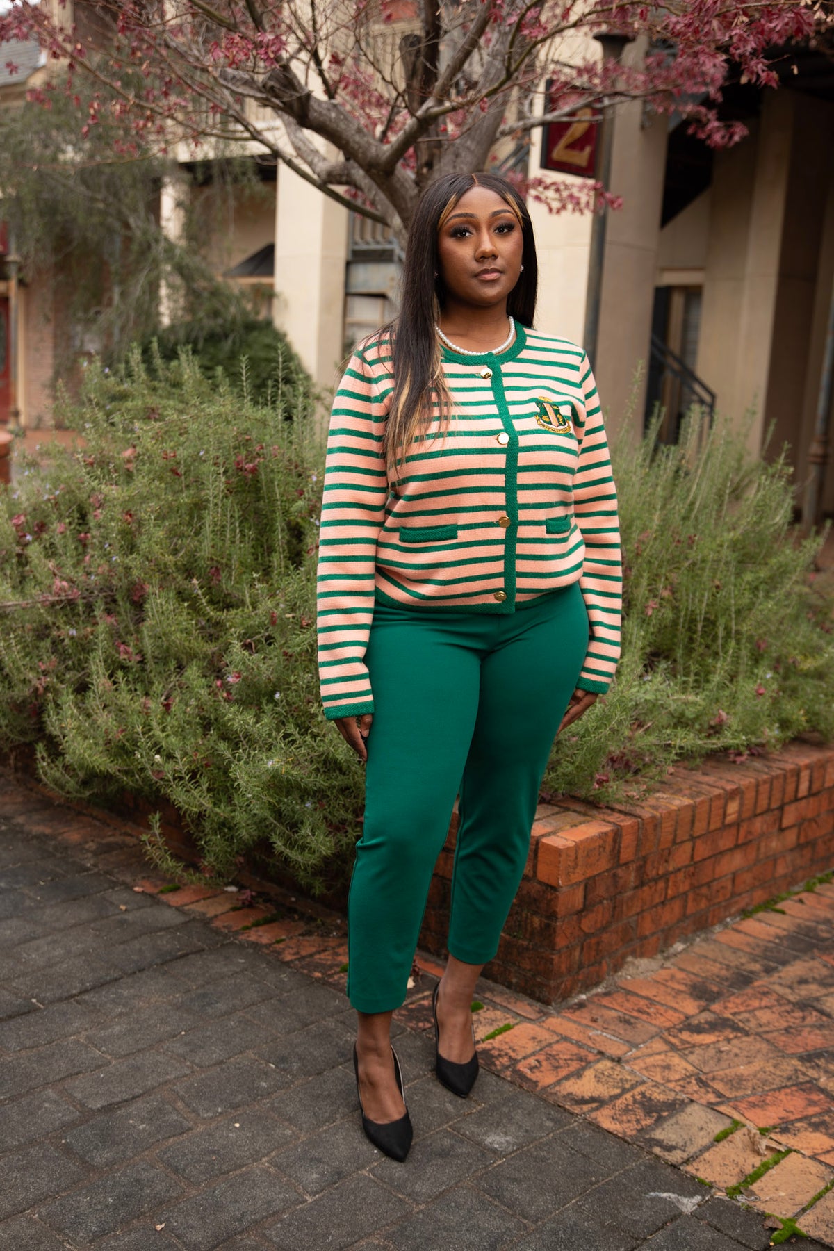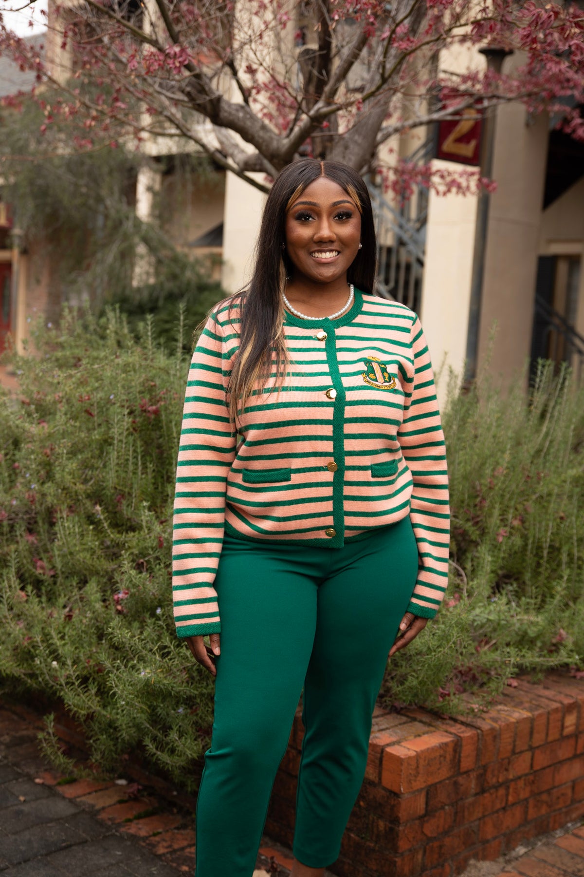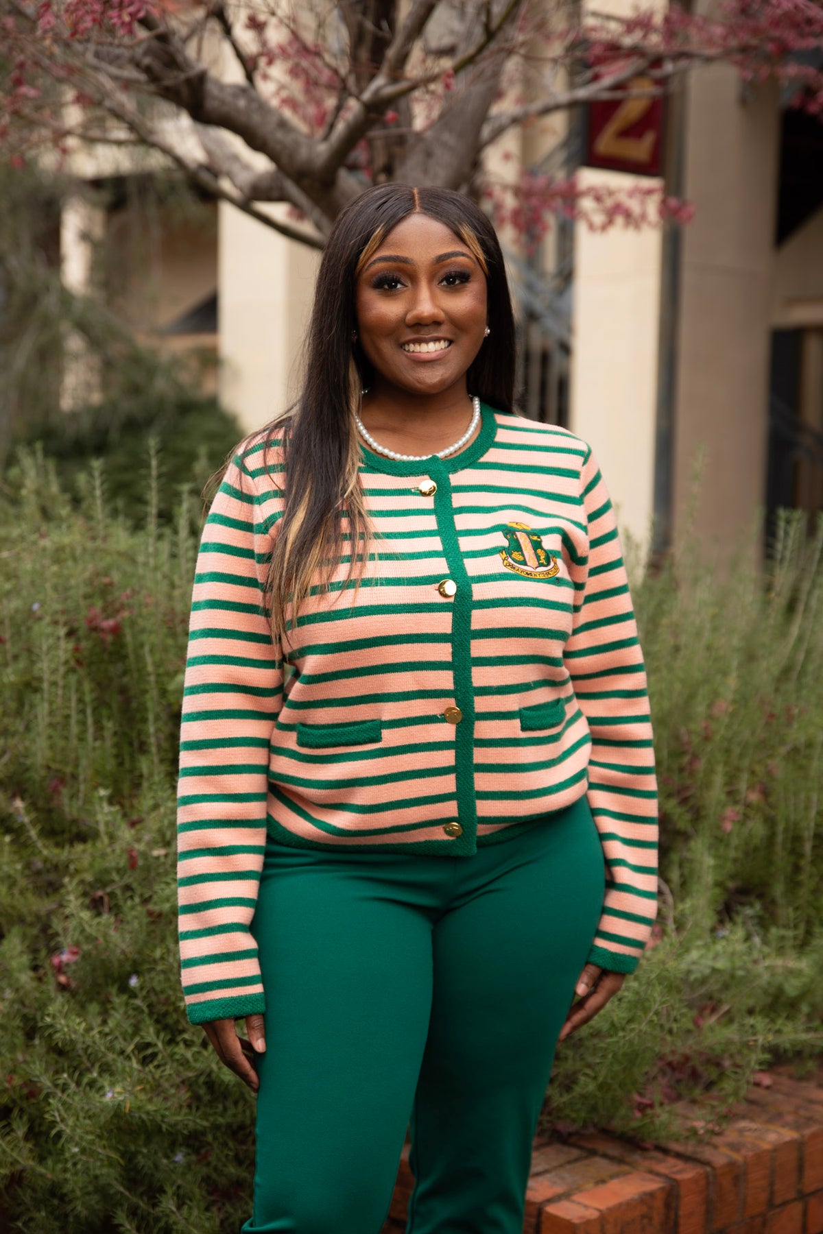 Elegant, polished, and unmistakably Alpha Kappa Alpha—this AKA Striped Cardigan is a timeless statement piece that blends classic style with sorority pride. Designed in the signature soft pink and ivy green color palette, this cardigan features clean horizontal stripes that deliver a refined yet collegiate aesthetic.