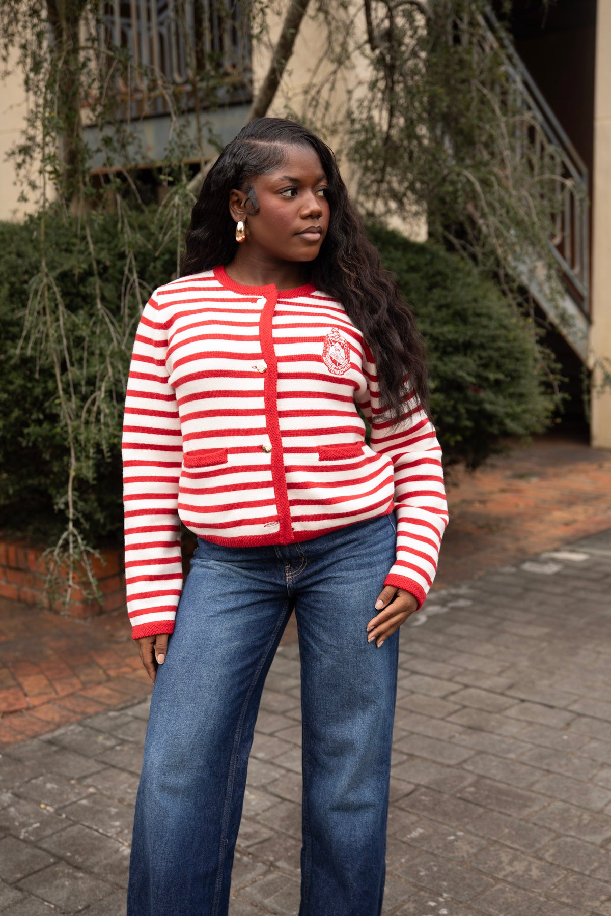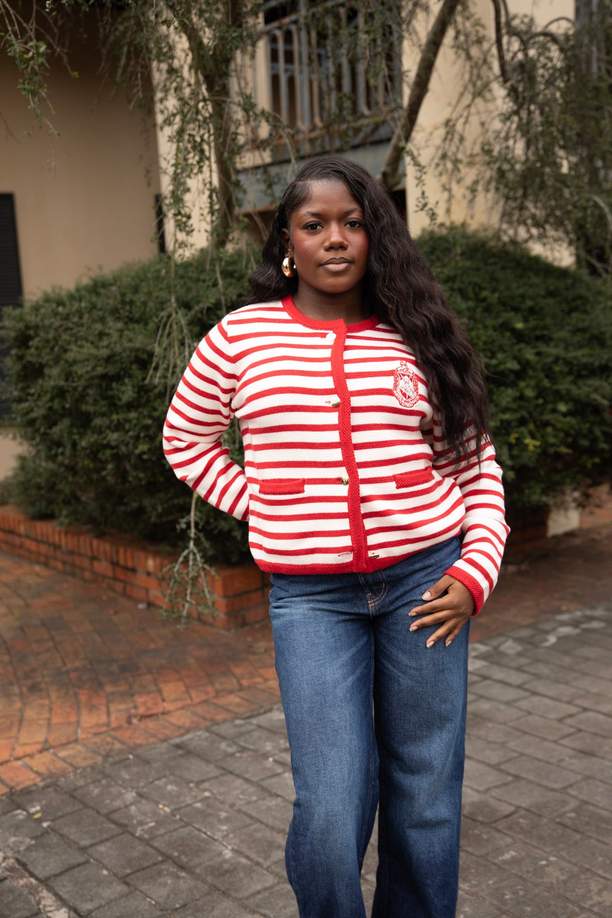 Classic style meets timeless sisterhood in this beautifully crafted Delta Striped Cardigan. Designed with bold horizontal red and white stripes, this cardigan delivers a refined yet collegiate look perfect for year-round wear.