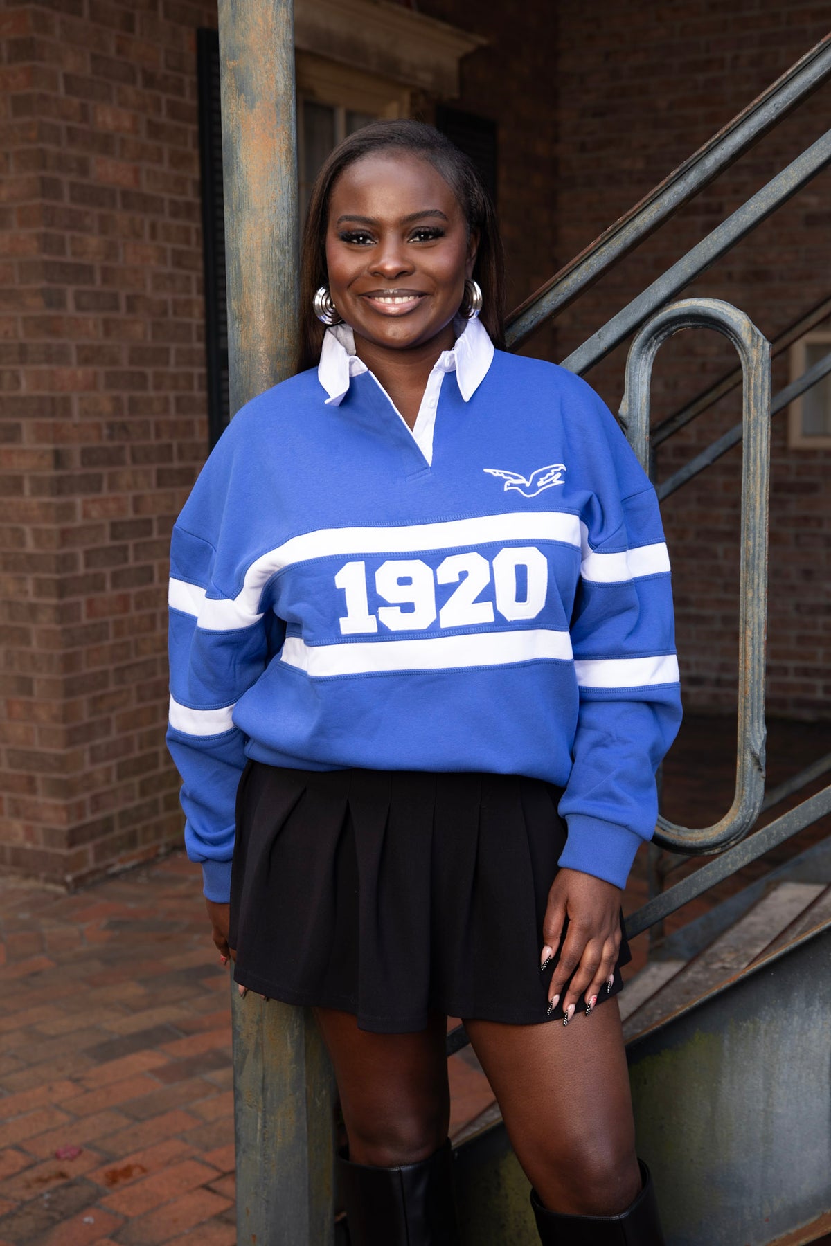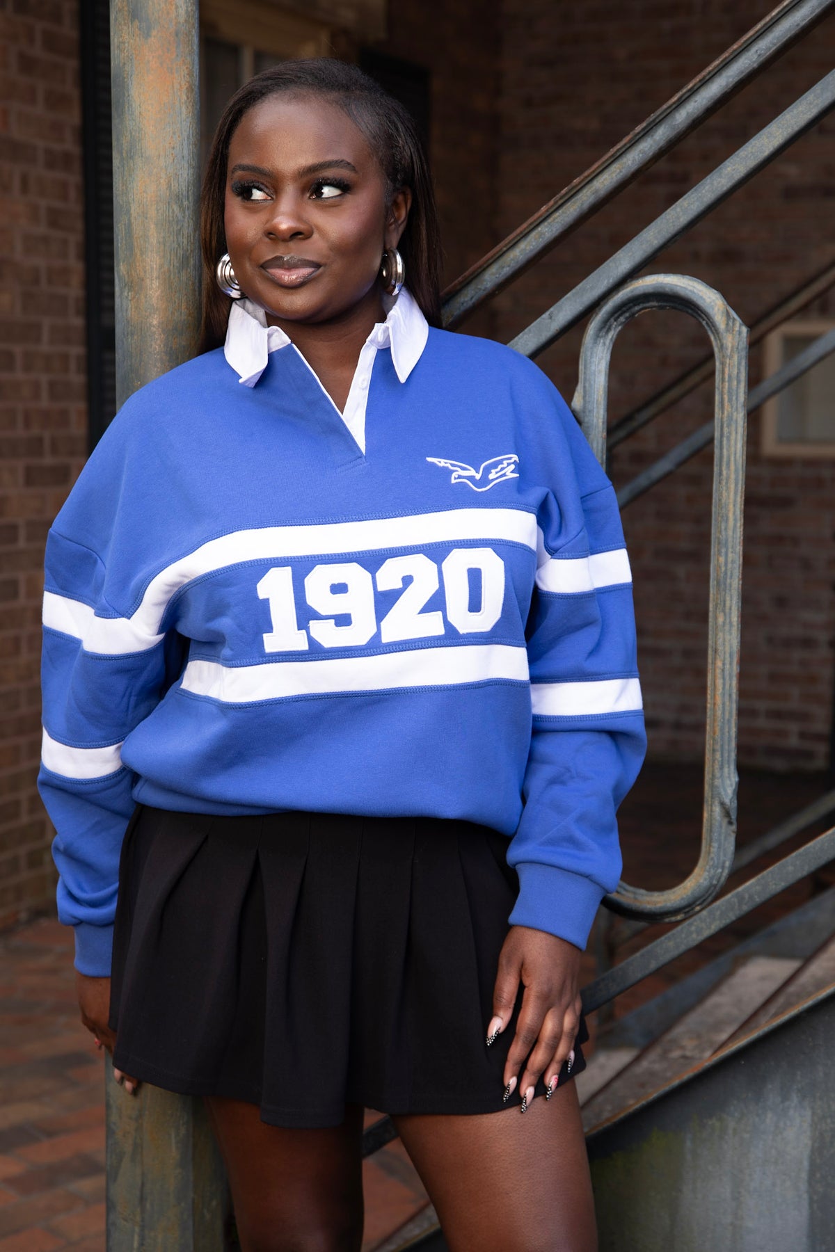 Centered on the front is the iconic “1920” appliqué, honoring the founding year of Zeta Phi Beta Sorority, Inc., while the embroidered dove emblem on the upper chest adds a refined symbolic touch. The traditional rugby-style white collar and relaxed fit make this piece both polished and comfortable, perfect for all-day wear.